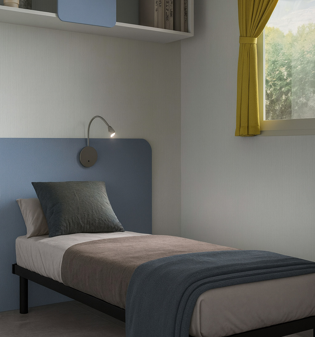 Der Schlafbereich besteht aus einem Doppelzimmer und einem Einzelzimmer, ideal für einen erholsamen und intimen Urlaub.