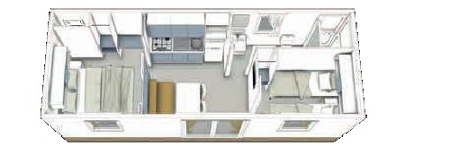 Die Mobile Home Rosa bietet 24 m² Komfort, gedacht für zwei Personen.